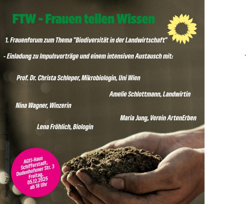 1. Frauenforum zum Thema „Biodiversität in der Landwirtschaft“ für alle Mitglieder und Interessierte – m/w/d Freitag05.12.202518:00 - 22:00 UhrAGfJ-HausDudenhofener Str. 3Schifferstadtorganisiert von Bd 90/Die Grünen Kreisverband Rhein-PfalzDownload als ics-Datei