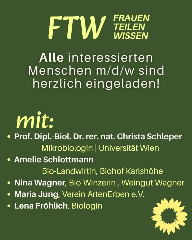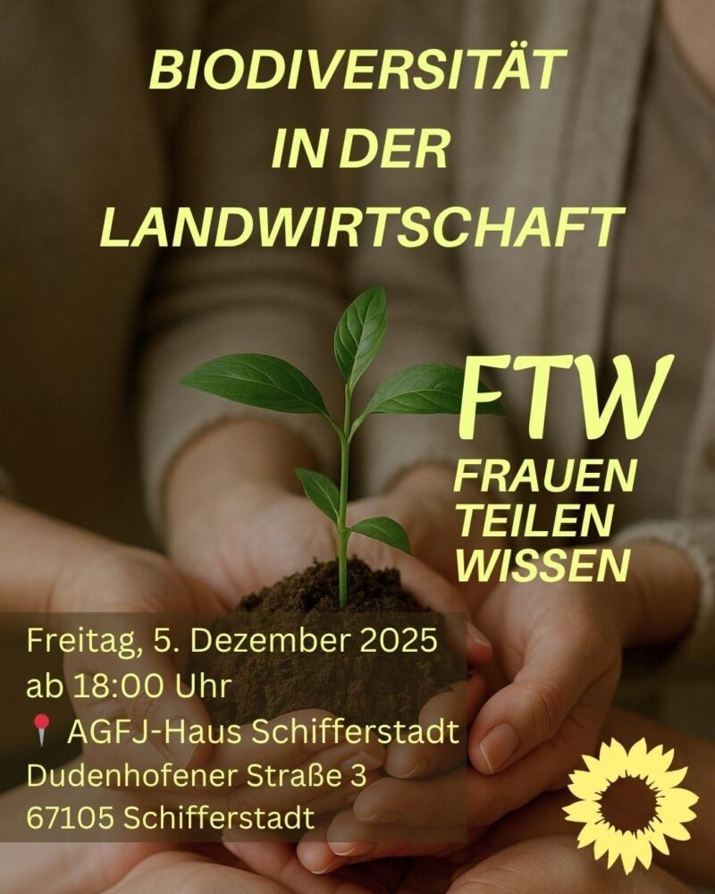 1. Frauenforum zum Thema „Biodiversität in der Landwirtschaft“ für alle Mitglieder und Interessierte – m/w/d bitte anmelden unter buero@gruene-rhein-pfalz.de Freitag05.12.202518:00 - 22:00 UhrAGfJ-HausDudenhofener Str. 3Schifferstadtorganisiert von Bd 90/Die Grünen Kreisverband Rhein-PfalzDownload als ics-Datei